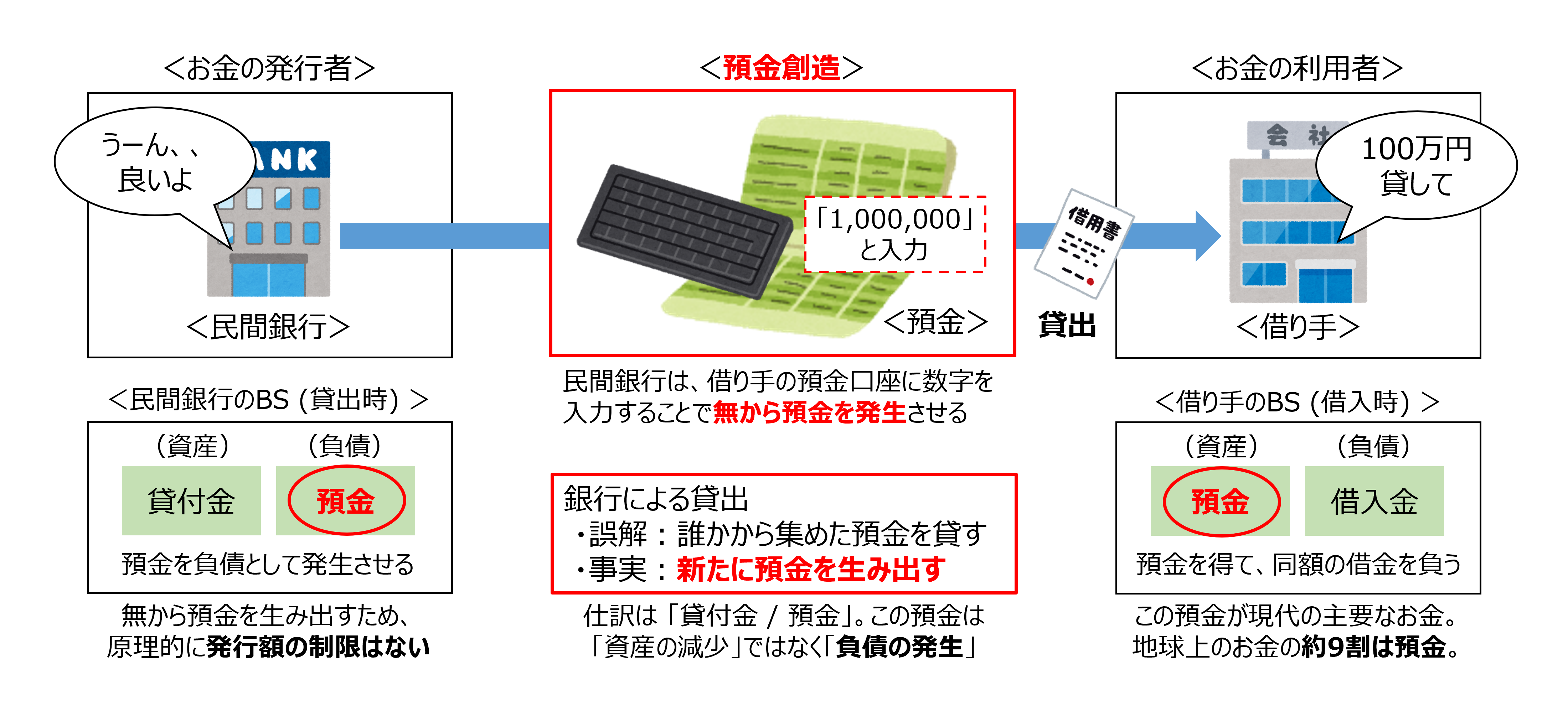 このように、現代のお金はほとんどが預金であり、預金を発行できるのは預金創造の機能を持っている民間銀行だけです。 そして新たな預金は、誰かが民間銀行から借りない限り、私たち「お金の利用者」の世界には供給されてこないのです。