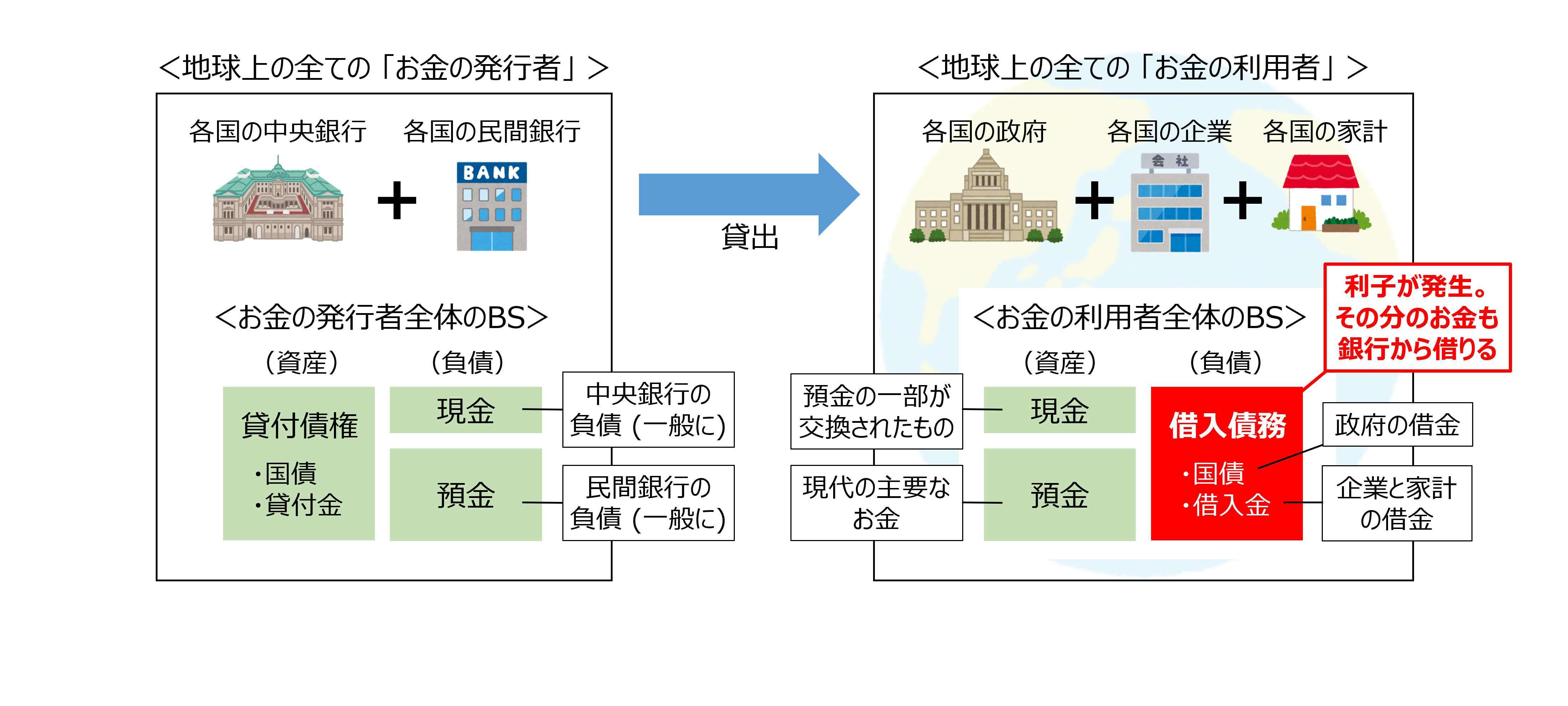 【補足】ここではお金と借金だけに着目していますが、それらを含めた資産全体と負債全体もまた、地球上の利用者全体を連結したバランスシート上では同額となり、純資産や純負債はゼロです。 なぜなら、誰かの資産は誰かの負債になるはずですが、その「誰か」は全員地球上にいるからです。 もしこの連結バランスシート上で資産か負債のどちらかが多い、ということになれば、地球外の宇宙人に対して貸し借りがある、ということになってしまいます。