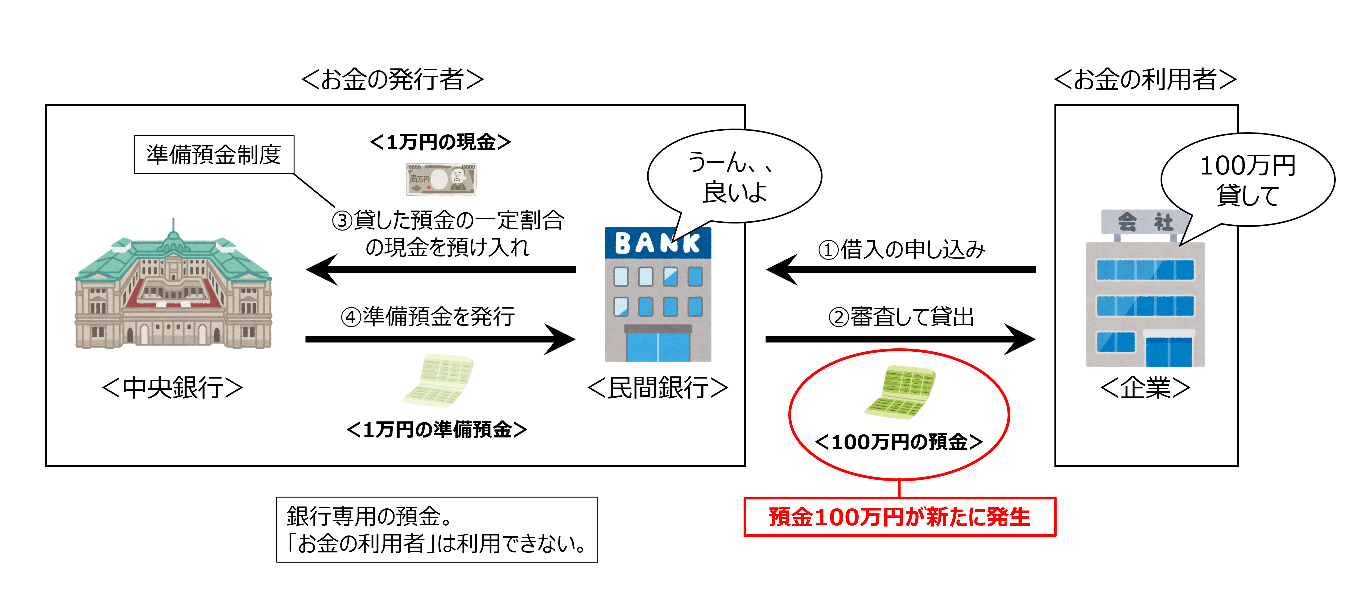 ここまでは民間銀行と企業のみのやり取りであり、まだ中央銀行は登場しません。
