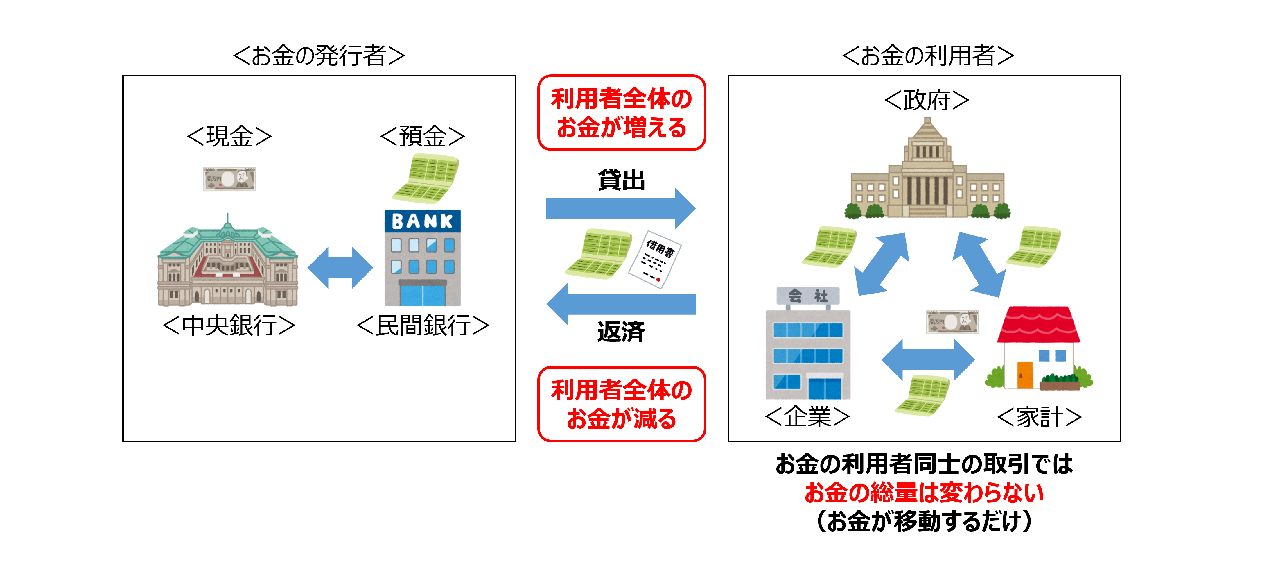 あくまで利用者全体のお金が増えるのは「お金の発行者」である銀行が貸し出した時のみであり、利用者全体のお金が減るのは銀行に借金を返済した時のみです。 そして政府も含めた「お金の利用者」同士の取引では、利用者全体のお金の量は変わりません。