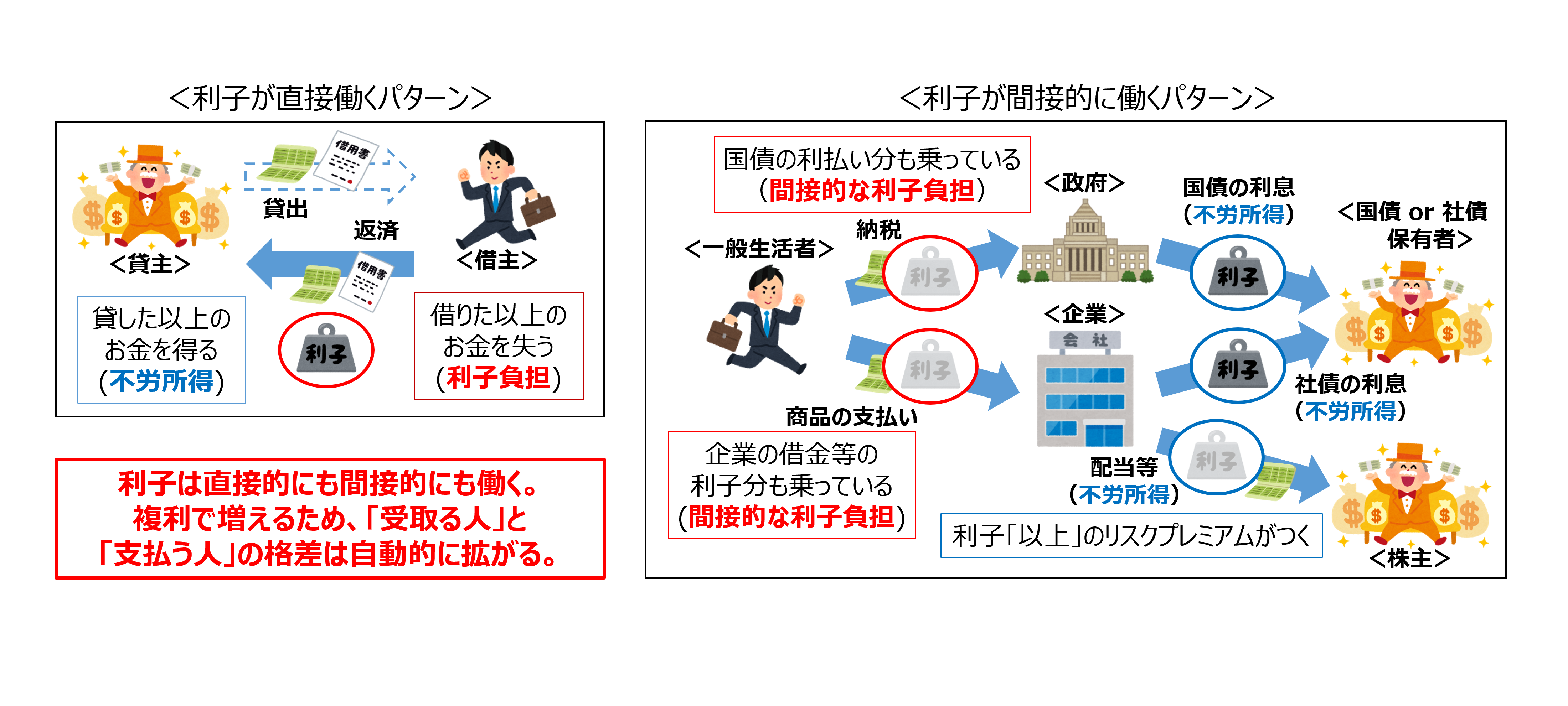 利子は直接的にも間接的にも、私たちの経済生活に深く根差しています。 お金を借りた人は、元金に利子を加えて返済することになるため、借りた以上のお金を失います。 逆にお金を貸した人は、貸した以上のお金を得ます。この利子分は純粋な不労所得になります。 以上は利子が直接的に働くパターンであり、私たちにとっても馴染み深いものです。 しかし、利子は私たちが普段意識しにくい領域でも間接的に働いています。