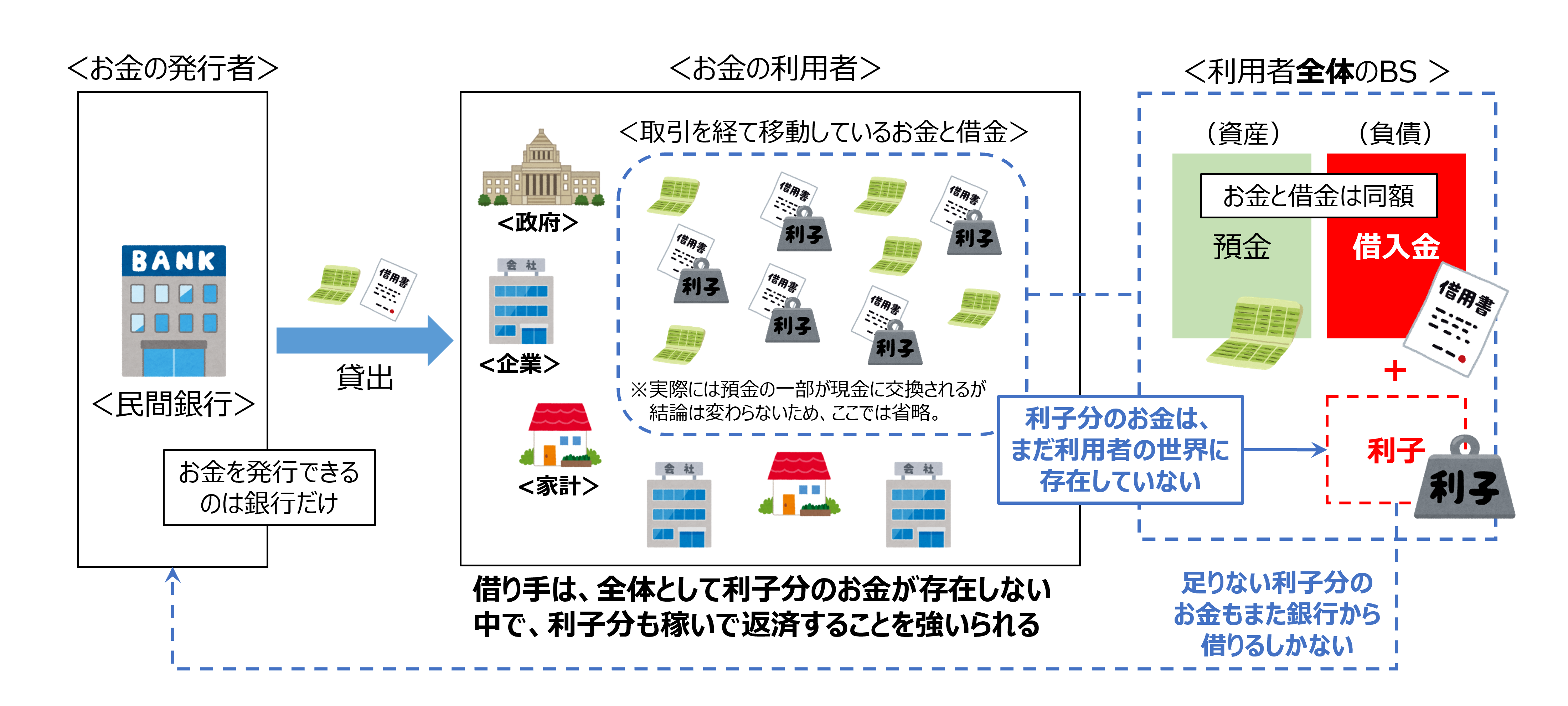 再び、お金の発行者と利用者という視点から利子を考えます。 お金を発行できるのは銀行だけであり、そのお金はすべて借金として利用者にもたらされます。 利用者の世界には、お金と同額の借金が常に存在しており、それらは様々な取引を通じて移動しています。 そして借金には利子が伴います。