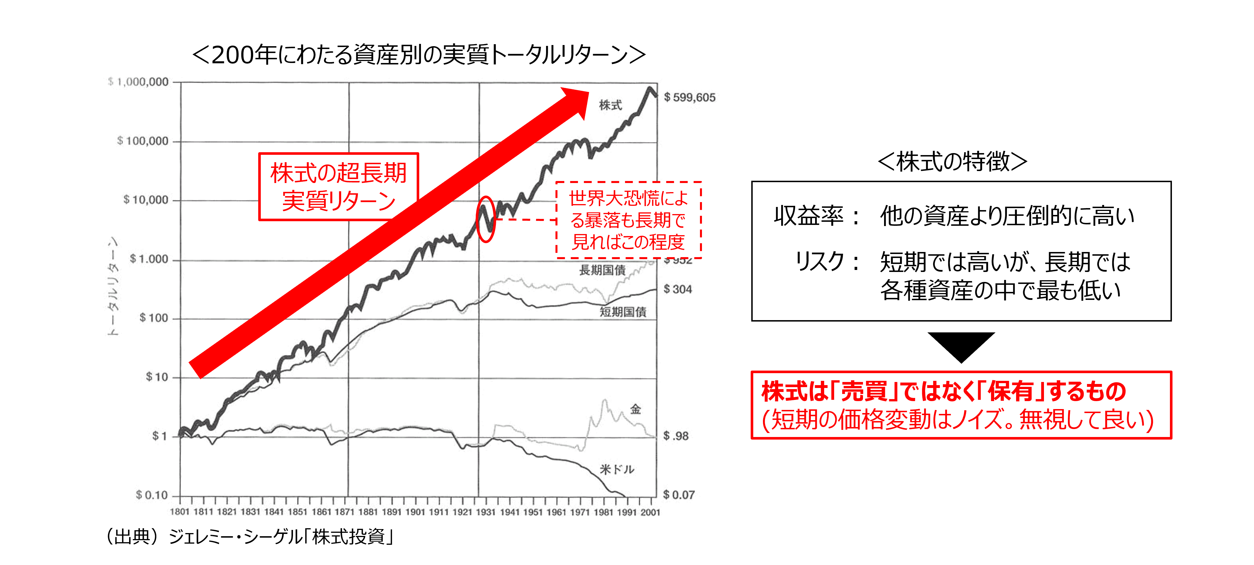 では、株式投資の実績はどうなっているでしょうか。 ジェレミー・シーゲル「株式投資」に、各種資産の中でとりわけ株式が優れていることを示すグラフが紹介されています。 上記の図は、200年にわたるアメリカでの各資産クラスの成績を表しています。 数字はインフレ調整後の実質リターンです。 一目で株式の圧倒的な優位性を見て取れます。 株式の折れ線は全体として見れば上向きの直線ですが、グラフの縦軸は対数スケールです。 実際には株価は指数関数的に大きくなり、この200年間で実に70万倍にもなっています。 これは、株式の価値が経済成長に合わせて複利で増え続けるためです(参照:1-7. 利子がもたらす競争と成長)。 なお、この株式優位の傾向はアメリカ以外の市場でも一般的に見られるものです。