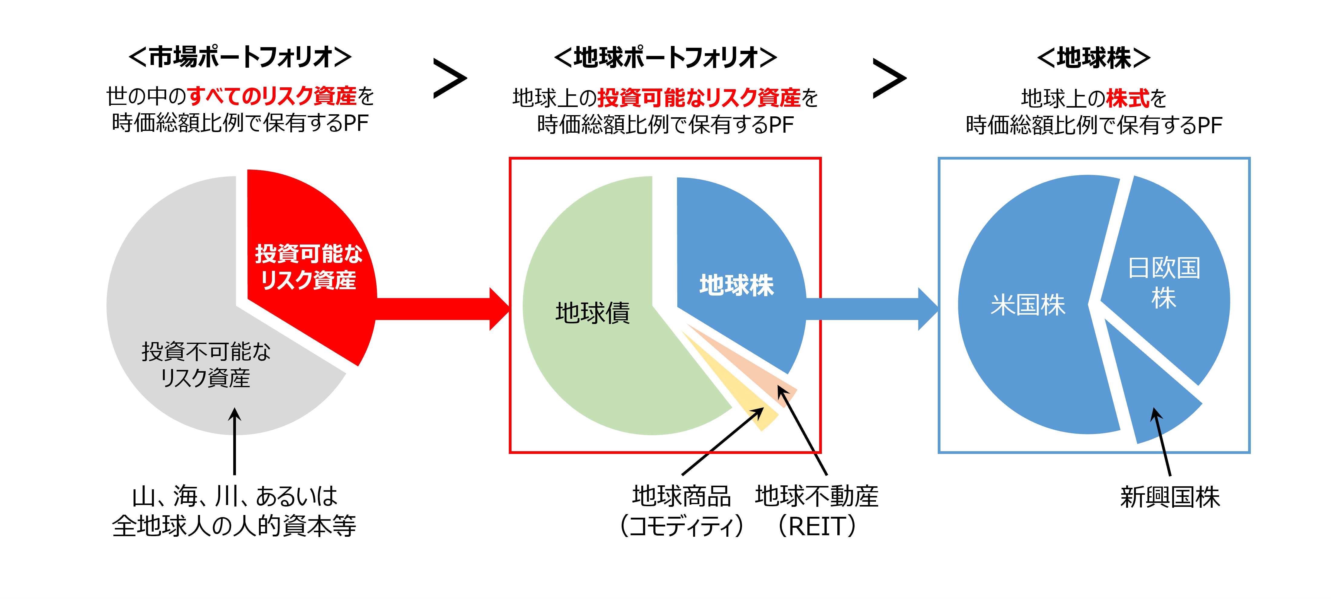 そこで、投資不可能な領域は仕方ないとしても、せめて次善策として「今日地球上で広く投資可能なリスク資産を網羅したポートフォリオを作ろう」と発想できます。 そのようなポートフォリオを、本サイトでは「地球ポートフォリオ」(以下、地球PF)と呼びます。 市場PFと地球PFの関係は「市場PF>地球PF」となります。 2018年現在、一般庶民が広く投資可能な資産クラスは、株式、債券、不動産、商品です。 つまり地球PFとは、地球全体の株式、債券、不動産(REIT)、商品(コモディティ)を時価総額に比例した比率で保有するポートフォリオです。 実は地球PFこそ、最終的に目指すことになるポートフォリオです。 地球上でお金が投じられる資産を可能な限り捕捉する意味でも、資産クラスの分散の観点からも、最終的には地球株に留まらず、地球上で投資可能な資産全体の縮小コピーを保有すべきです。