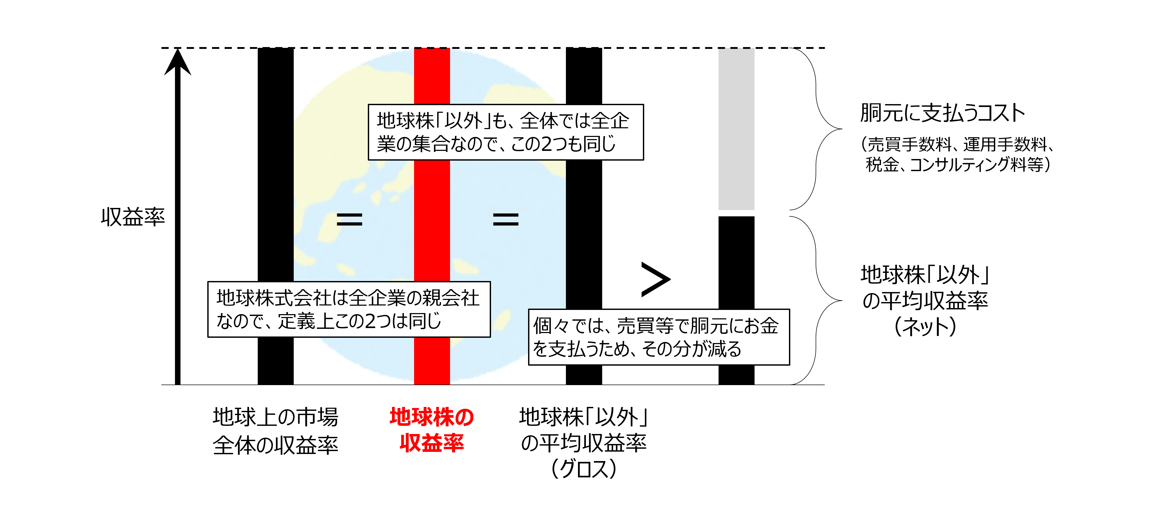 個別の株式を頻繁に売買したり、株式ポートフォリオの中身を入れ替えたりといった行動は、本来不要なコストを増やし、ただ胴元を儲けさせるだけの無駄な行動です。 一方、株式の全集合である地球株を保有する場合、他に売買すべき株式の候補はそもそもありません。 地球株の収益率は地球全体の株式市場の収益率と同じなので、単純に地球株を保有していれば、余計なコストを支払わずに、地球全体の企業の成長をそのまま享受できます。