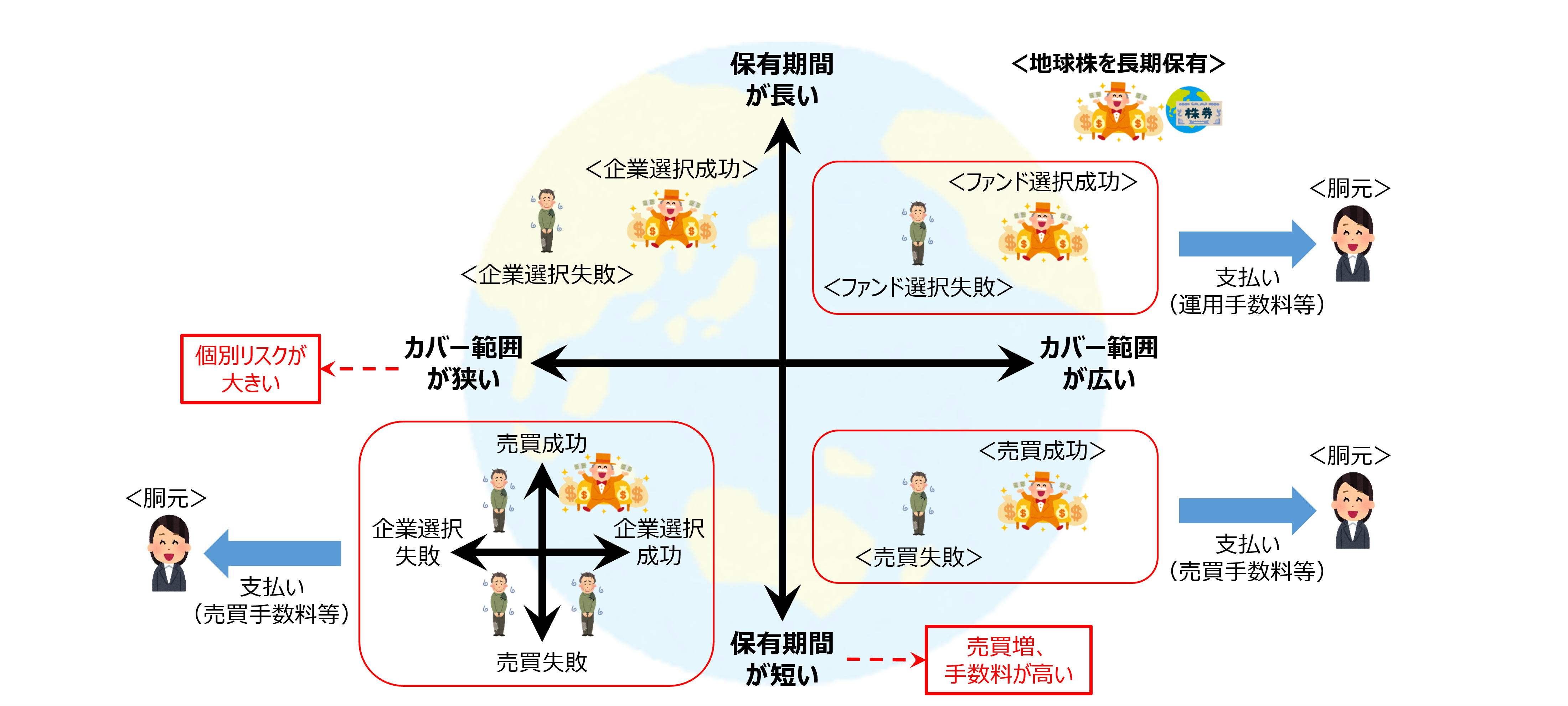 本サイトでは地球株の保有を推奨していますが、当然それ以外の戦略を取る株主(投資家)も多数います。 というより、ほとんどの投資家がそうです。 ここでは参考までに、地球上の投資家を、株式の「保有期間」と「カバー範囲」の2軸で分類します。 マトリクスの縦軸は保有期間で、こちらは長ければ長いほど長期的なリターンが良くなります(参照:3-1. 株式の実績)。 なぜなら、そうすればピンハネシステムの働きを「ピンハネする側」として長く享受できることに加え、無駄な売買手数料が発生しないからです。 横軸はカバー範囲で、こちらは広ければ広いほど長期的なリスクが少なくなります。 なぜなら、株式の種類を増やせば増やすほど、つまり分散すればするほど個別リスクを減らすことができるからです(参照:3-6. 地球株のリスク)。 この2軸のマトリクスで、投資家をざっくりと4象限に分類できます。