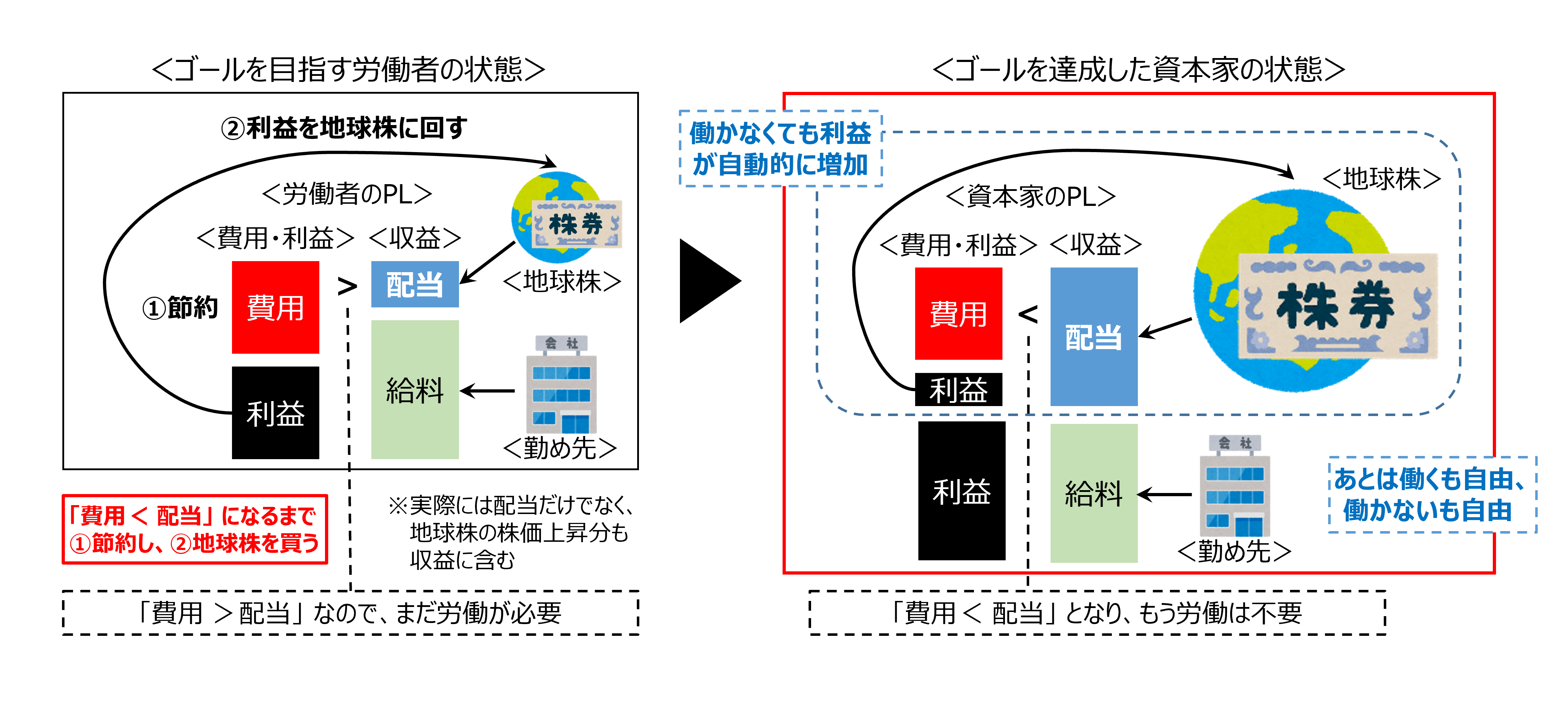 以上のように、私たちが目指すべき当面のゴールは、資産収入だけで生きていける状態になることです。 そのために実践することは、「節約」と「地球株への投資」の2つだけです。 やがて「生活費<地球株の収入」の状態になり、労働は必須ではなくなります。