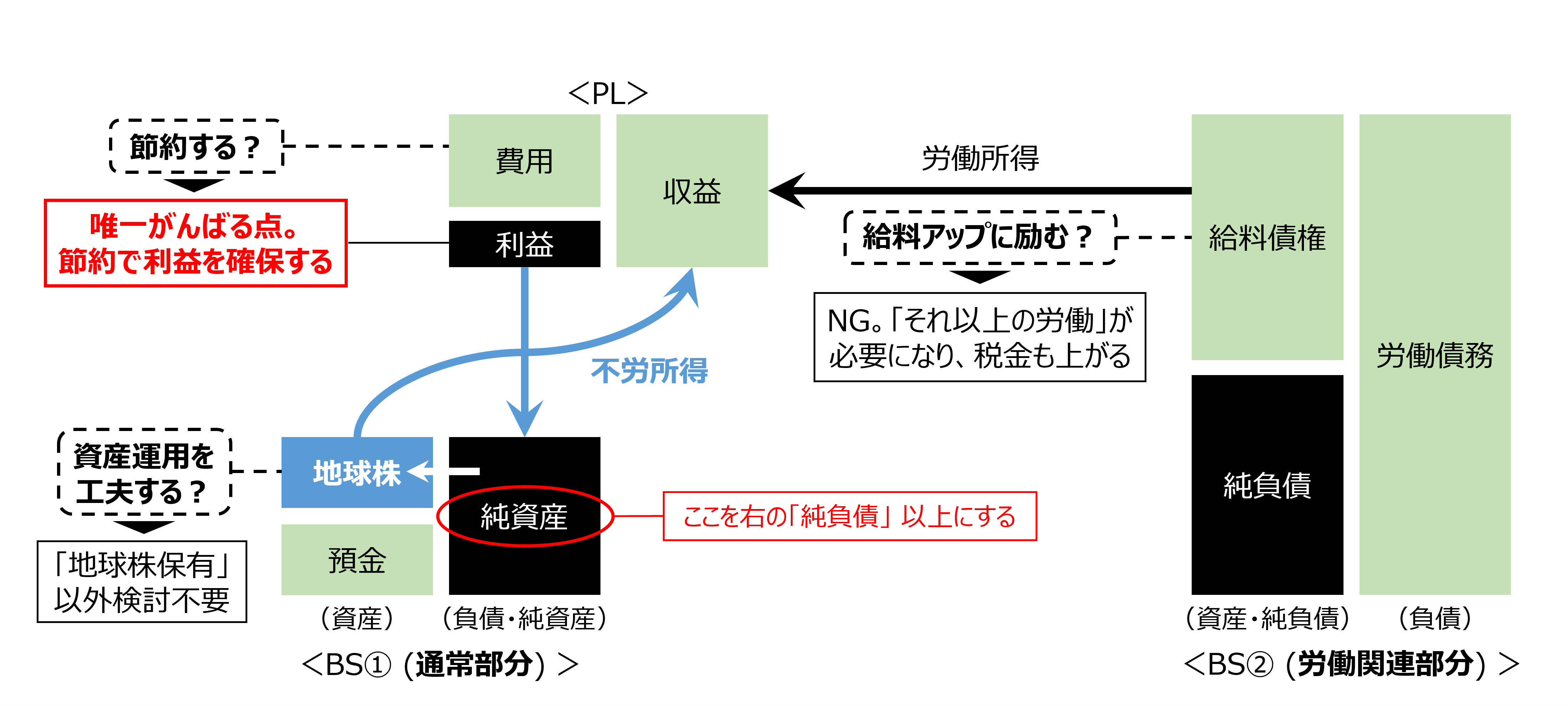 最後に「資産を運用する」ことについて検討します。 これは当然に必要です。 当面のゴールとは、労働による収入ではなく資産がもたらす収入のみで生きていけるようになることだからです。 しかし、運用にあたって困難なこと、工夫すべきことは一切ありません。 理由は単純で、やるべきことは「地球株の保有」のみだからです。 まず、投資すべき資産は「地球株」一択です。 これ自体が株式の全集合であるため、他の株式なり国なりを選択する余地がありません(参照:3-3. 地球株式会社)。 また、その運用方法は単に「保有する」だけであり、事実上何もしません。 資産運用に関する本は山ほどありますが、地球株を保有する戦略を取る限り、能力も労力も、あるいは考えることすら一切不要です。