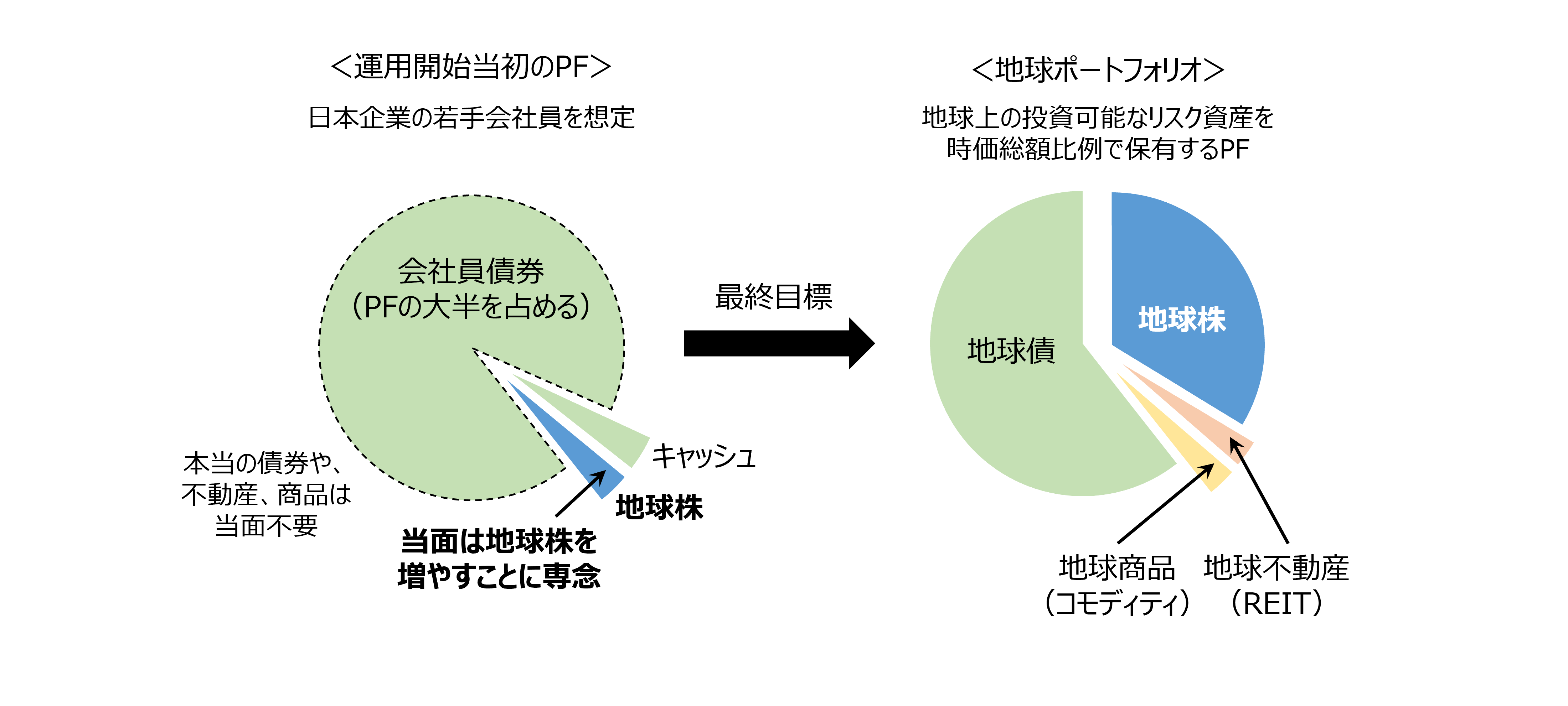 いずれにしても会社員債券の存在を前提にすると、「ポートフォリオのほとんどが債券」という状況がしばらく続きます。 よって、本物の債券への投資は当面不要となります。 一方、債券や株式以外の資産クラスについては、その割合が非常に小さくなるため、やはり当面は投資不要となります。 したがって、最終的には地球PFを目指すものの、当面は債券の次に大きな市場規模を持つ株式、すなわち「地球株」のみを増やしていきます。