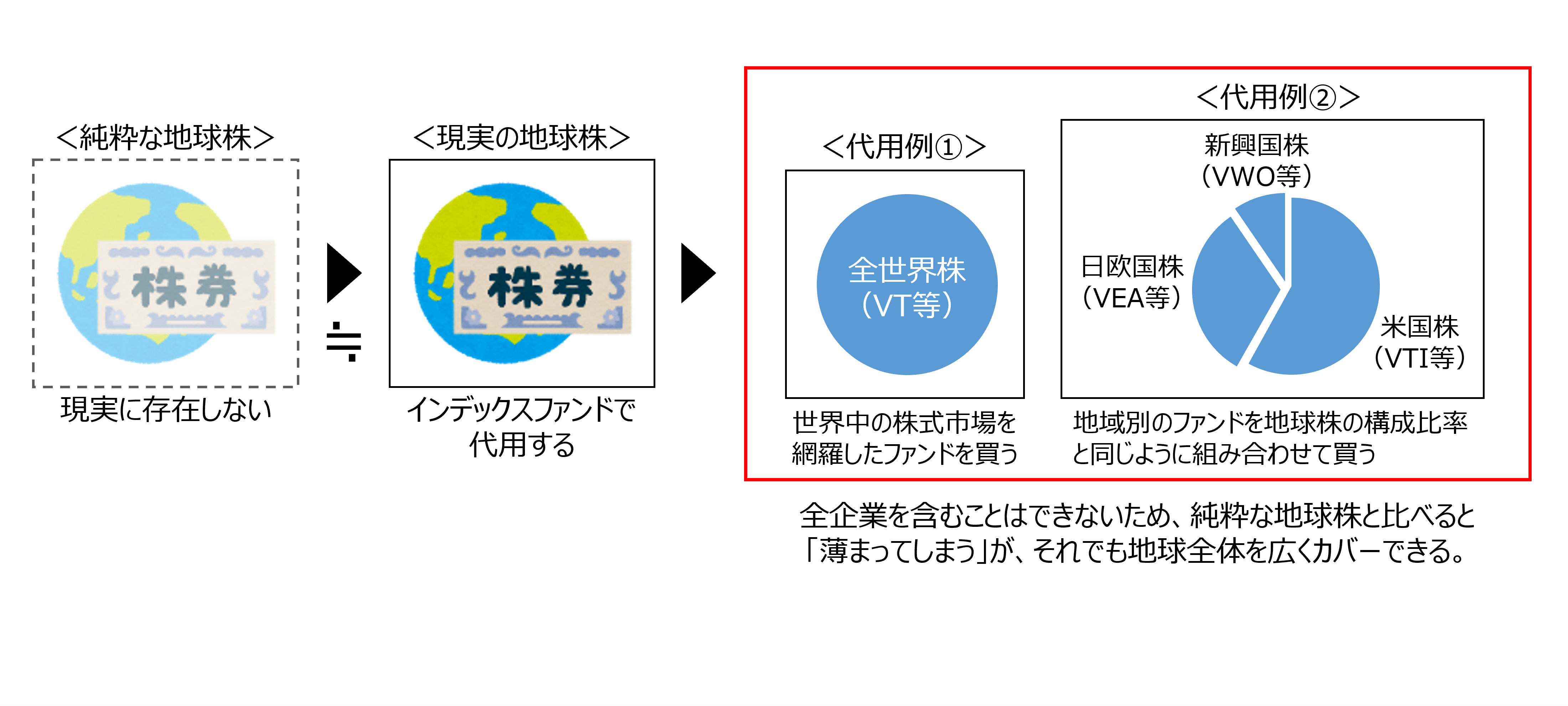 たとえば、世界中の株式市場を網羅したインデックスファンドやETFといった投資商品があります。 これは単独で、ほぼそのまま地球株を代用できるものです。 また、先進国や新興国、あるいは各国の株価指数に連動する商品もあります。 これらは、地球株の構成比率と同じになるように組み合わせることで、地球株の代用となります。 そうしておけば、各株式市場の時価総額が今後変化したとしても、それは地球株の構成比率の変化と同一なので放っておいて良いです。 つまり、この投資法ではリバランスの作業は不要です。
