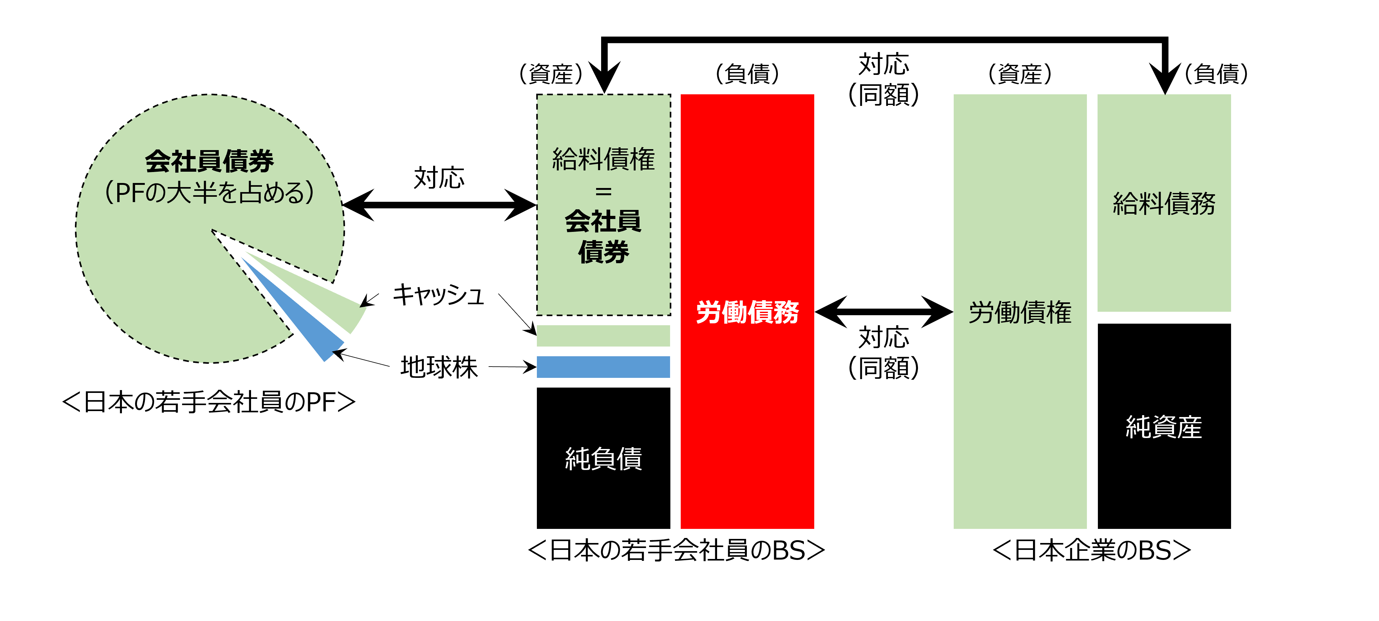 「2-7. 労働のピンハネ」で、会社と会社員の関係から、両者のバランスシートに労働と給料に関する資産や負債を計上することができると説明しました。 その上で、会社員のバランシートには給料債権が資産計上されています。 日本の会社員はクビになりにくく、毎月ほぼ定額の給料を得られることから、彼らの給料債券は諸外国の労働者と比較して突出して大きくなります。 この給料債権は長期的に安定した配当(給料)をもたらすという意味で、ポートフォリオ内の「会社員債券」であると見なせます。 会社員債券は疑似的な日本債券であり、その額は退職するまでにもらえる給料総額の割引現在価値です。 そのため、一般に若ければ若いほど大きくなります。 しかも、給料は通常物価に連動するため、会社員債券は物価連動債であるとも考えられます。 つまり、日本型企業に勤める会社員は最初から巨額の債券を保有していることになります。